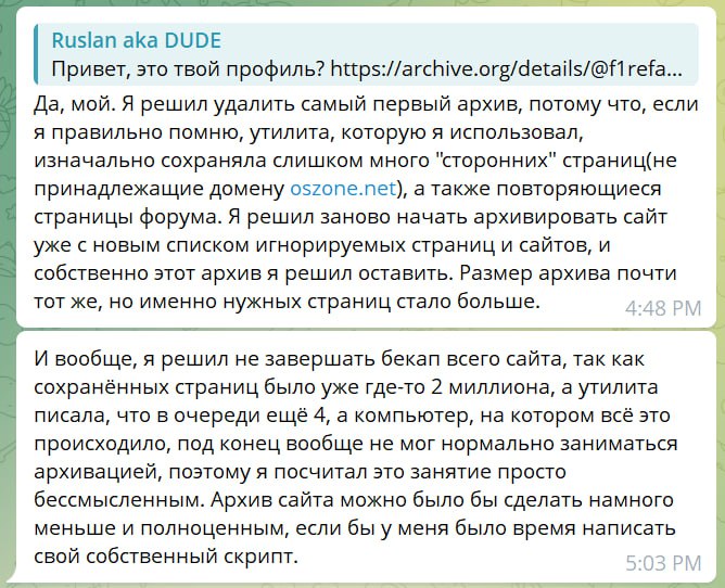 Попытки заархивировать это наследие наткнулись на технические трудности. Форум делит сервер и SSL-сертификат с личным блогом одного из админов, что мешает работе Internet Archive.